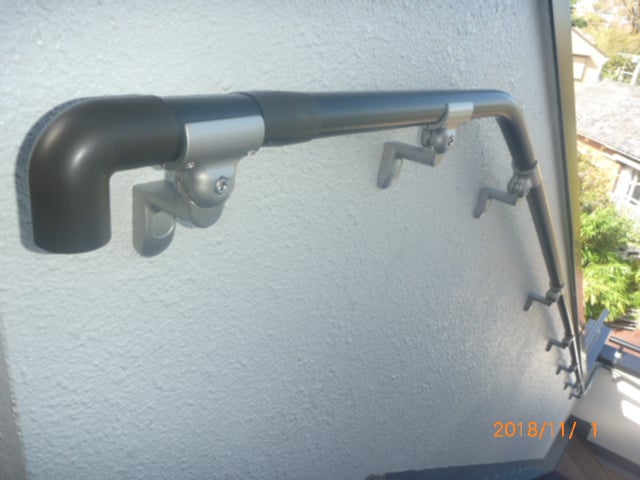 先ほどの曲げ手すりも直線部に使いますが、違いはブラケット(または支柱)の取付間隔で、曲げは700~800ミリ(条件による)、直線用は1200ミリまで可能です。(要は金物の個数を少し減らすことができるということ)